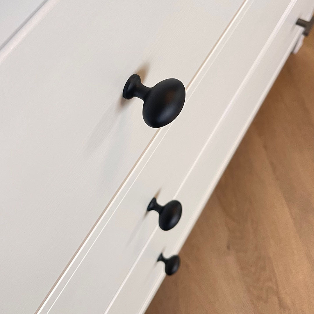 This large matt black furniture knob is a real asset to your interior . The Sergio knob has a matt black coating and is designed with beautiful curves . It has a light , classic style , which makes it suitable for many different styles . The furniture knob is ideal for brightening up furniture , such as cupboards and drawers , but also in the kitchen . The knob is made of high - quality zinc ( stainless ) , which gives it a long lifespan . The furniture button is easy to attach with the supplied screw .