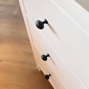 This large matte black furniture knob is a real asset to your interior . The Sergio knob has a matte black coating and is designed with beautiful curves . It has a light , classic style , meaning it fits into many different styles . The furniture knob is ideal for brightening up furniture , such as cabinets and drawers , but also certainly in the kitchen . The knob is made of high - quality zinc ( stainless ) , which gives it a long life . The furniture button is easy to attach with the supplied screw .