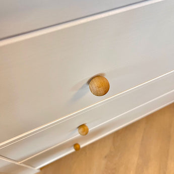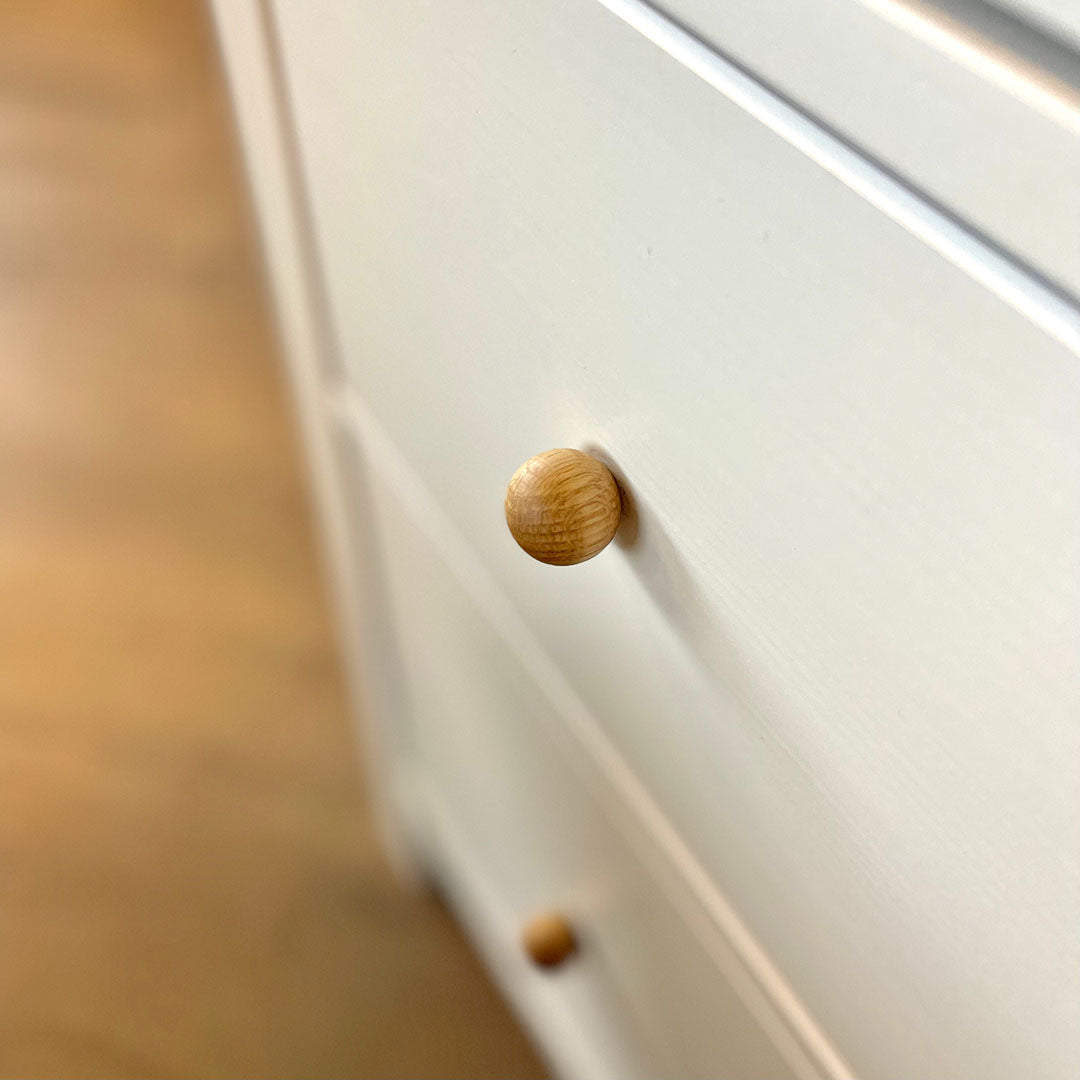 Give your interior a warm and natural look with this stylish, spherical oak furniture knob. The beautiful wood grain and the characterful, light to warm oak color create a timeless and understated look on any drawer or cabinet. Thanks to its rounded shape, the knob fits comfortably in your hand, and the meticulous finish feels smooth and refined. Ideal for subtly updating your kitchen, dresser, or bedside table – a small detail that instantly adds ambiance.