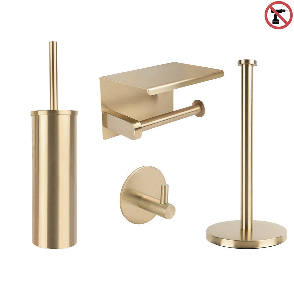 Is your toilet almost ready, but you don't want to drill and want a stylish look in an instant? Then choose this golden 4 - piece toilet accessory set ! This set consists of four different accessories that are ready to use . You do n't have to drill or measure anything , the accessories immediately give your toilet the look you are looking for . No technical knowledge or tools required , very easy to assemble and therefore ideal for a quick and easy renovation . The toilet accessories have a modern , minimalist style and fit in with any interior . They are easy to clean , move and will last for years .