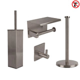 Is your toilet almost ready, but you'd rather not drill and want a stylish look in a flash? Then choose this 4 - piece Gunmetal toilet accessories set ! This set consists of four different accessories that are ready to use immediately . You do n't need to drill or measure anything ; the accessories instantly give your toilet the look you 're looking for . No technical knowledge or tools required , very easy to assemble and therefore ideal for a quick and easy renovation . The Gunmetal toilet accessories have a modern , minimalist style and suit any interior . They are easy to clean , move , and will last for years .