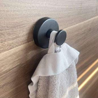 Bring order and style to your bathroom, toilet, or kitchen with the black round towel hook from Yessential. Thanks to the twist-lock system, you can easily attach this hook to smooth surfaces—no drilling or gluing required!