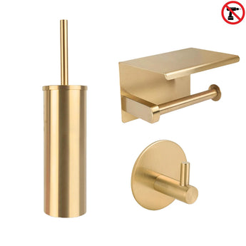 Is jouw toilet zo goed als klaar, maar wil je liever niet boren en wil je een stijlvolle look in een handomdraai? Kies dan voor deze 3-delige toilet accessoires set! Deze set bestaat uit drie verschillende accessoires die direct klaar zijn voor gebruik. Je hoeft niet te boren of iets op te meten, de accessoires geven je toilet direct de uitstraling waarnaar je op zoek bent. Geen technische kennis vereist of gereedschap, zeer gemakkelijk te monteren en daarom ideaal voor een snelle en makkelijke renovatie. De goudkleurige WC-accessoires hebben een moderne, minimalistische stijl en passen bij elk interieur. Ze zijn gemakkelijk schoon te maken, te verplaatsen te maken en zullen jarenlang meegaan.