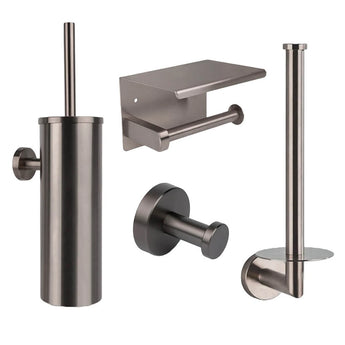 Wil je je toilet en/of de badkamer moderniseren? Dan is dit dé WC-accessoires set uitgevoerd in de luxe afwerking Gunmetal die je zoekt! Deze luxe toiletaccessoires bieden een luxueuze look en aanvulling in jouw WC/badkamer. Daarbij is Gunmetal een populaire afwerking, omdat het tegen zwart aanleunt, wat de badkamer een moderne look geeft. Gunmetal is makkelijk te onderhouden, waardoor het een geweldige keuze is voor toiletaccessoires. Door deze WC set hoef je niet alle accessoires los te kopen, zo maak je in één keer je badkamer écht af en ben je ook nog eens vele malen goedkoper uit. Vanwege wij groot inkopen kunnen we deze aanbieden tegen een leuk betaalbaar bedrag inclusief gratis verzending!
