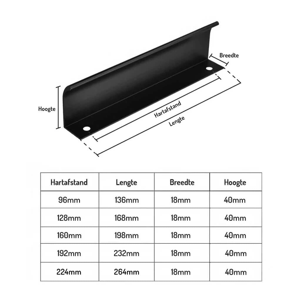 Handgrepen vervangen? Maar niet willen boren of zitten er geen gaten in de lades of deurtjes? Ga dan voor hoekgrepen! Geef je keuken, kasten en meubels direct een nieuwe moderne uitstraling met het rechthoekige design van de Enzo Black. Profielhandgrepen zijn gemakkelijk te monteren, door ze aan de achterkant van de deur / lade te bevestigen.